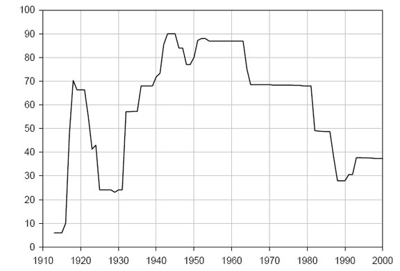 Одновременно с ростом государственных расходов элиты систематически уменьшали свое налоговое бремя (таким образом, переложив его на плечи среднего класса). Мало кто знает, что еще в 1960 г. федеральная ставка налога на доходы выше 1 миллиона была 86.9%.