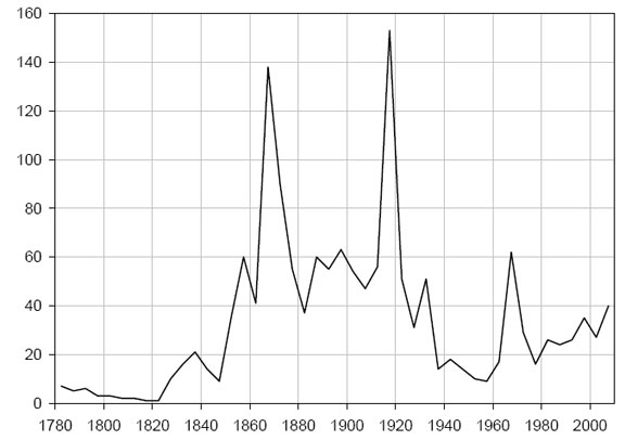 Рис. 9. Динамика политческой нестабильности в США, 1780–2009 гг. По оси абсцисс отложены количество за 5 лет летальных (как минимум, одна смерть) межгрупповых конфликтов (городские бунты, суды Линча, расовые погромы, и т.д.). Источник: неопубликованная работа автора. Гражданская война 1861–65 гг. не включена в этот график, так как ее масштаб был неспоставимо больше, чем все остальные конфликты.