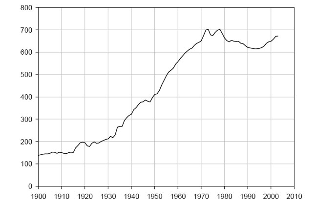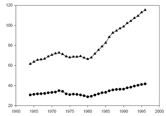 Между 1920-ми и 1970-ми годами реальная заработная плата выросла в 3.5 раза, а после 1970-х она стагнировала. На самом деле, ситуация даже хуже, чем показано на графике. Дело в том, что, начиная с 1983 г., государственные статистические органы стали систематически занижать официальную оценку инфляции (Филипс, 2008). После 1996 г. (когда был принят еще более «улучшенный» метод расчета) среднее расхождение между официальными данными по инфляции и оценками, основанными на критериях использовавшихся до 1983 г., составила 6%. Это означает, что рост заработной платы, показанный на графике после 1996 г. не является реальным.