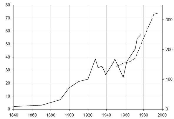 Рис. 6. Число студентов юридических факультетов на 100,000 населения (сплошная линия, левая шкала) и количество юристов на 100,000 населения (пунктир, правая шкала).