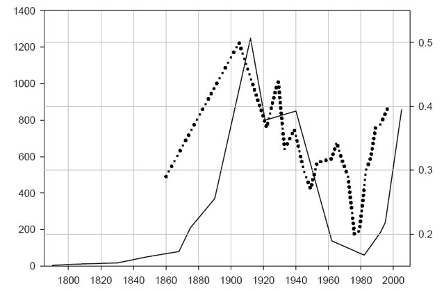 Рис. 1 показывает, что США испытали две волны иммиграции – в 19-м веке (по преимуществу из Европы) и во второй половине 20-го века (со всего мира).