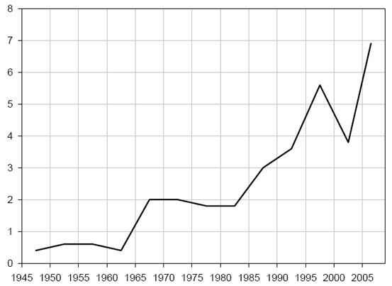 Рис. 10. Динамика «массовых расстрелов» в США, 1945–2008 гг. По оси абсцисс отложено среднее число массовых расстрелов в год. Данные усреднены по пятилетиям. Из данных исключены случаи криминальных разборок, а также внутрисемейные убийства.