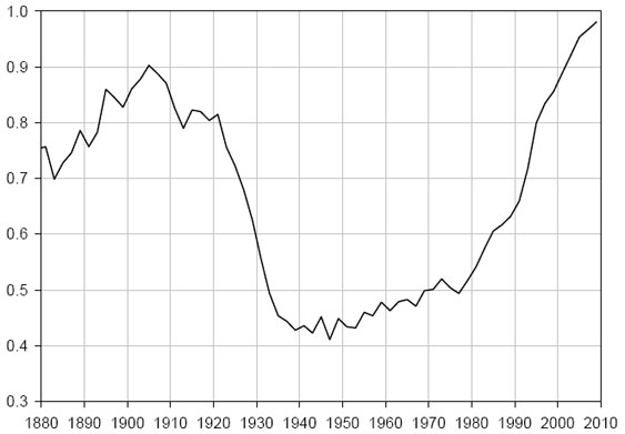 Рис. 11. Поляризация в американском конгрессе, 1879–2009 гг. (Маккарти и др. 2006)