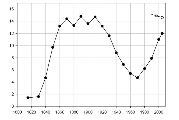 Рис. 1. Две волны иммиграции в США. По оси абцисс отложен процент американского населения, рожденных вне США. Для периода после 1960-го года график отражает только легальную иммиграцию. Добавив число нелегальных иммигрантов, мы получим оценку в примарно 15% (кружок, на который указывает стрелка), т.е. такой же уровень как и во 2-й половине 19-го века