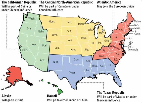 Чтобы подсластить горькую пилюлю, скажем, что свои футурологические прогнозы по распаду тех или иных государств дают и эксперты Второго и Третьего мира. К примеру, в России это делает бывший аналитик КГБ, а ныне «учёный-геополитик» Игорь Панарин. Несколько лет назад онпредсказал, что США к 2010 году распадётся вот на такие части: