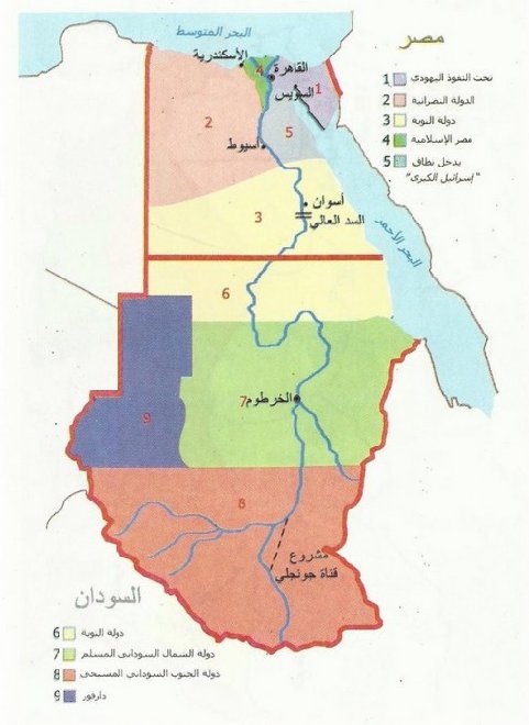 По Льюису, Египет должен распасться на 4 части. Первая – полуостров Синай и восточная часть дельты Нила. Это псевдогосударство должно попасть под контроль Израиля, служа буфером между ним и агрессивным, чудовищно перенаселённым северным Египтом (это второе, суннитское псевдогосударство со столицей в Каире). На севере этот рассадники средневекового варварства будет нейтрализовать ещё одно новообразование – коптская (христианская) территория со столицей в Александрии. Наконец, южная часть Египта тоже составит новое псевдогоусударство.