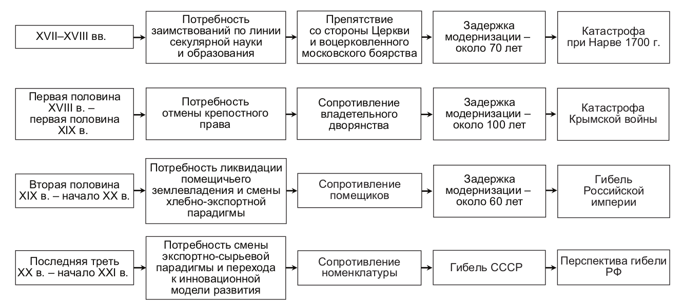 История России представляет череду примеров катастрофических событий вследствие запаздывания в реализации модернизационных задач. Главным препятствием всякий раз оказывалось сопротивление и инерционность политических элит. Видением задач модернизации страны исторически высшая российская власть, как правило, обладала. Не доставало именно технологического инструментария (рис. 1).