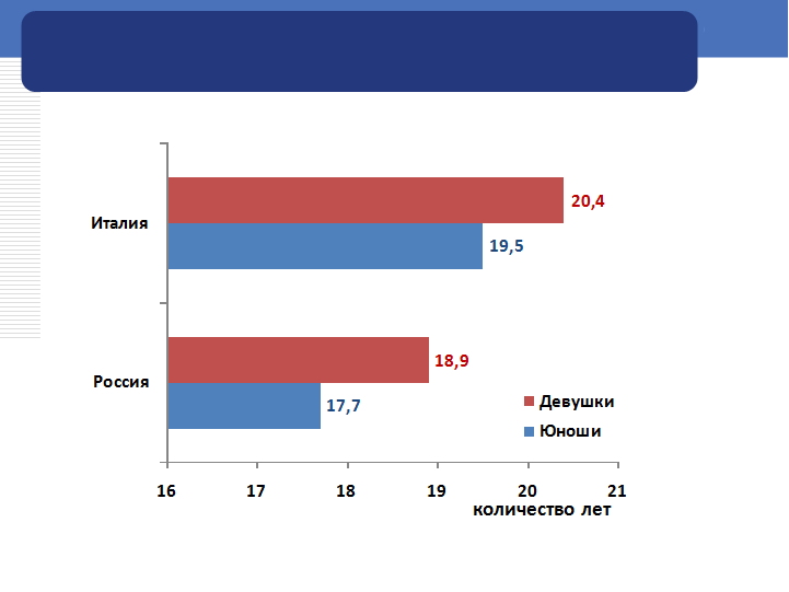 Рис. 17. Возраст начала половой жизни в России и Италии
