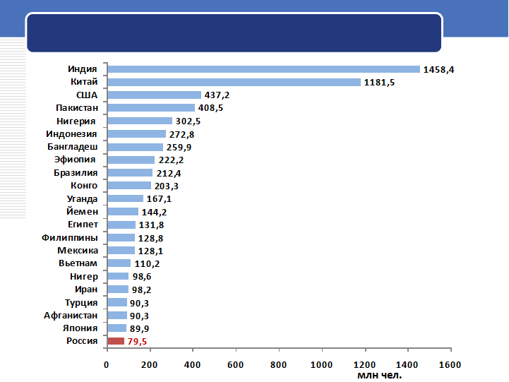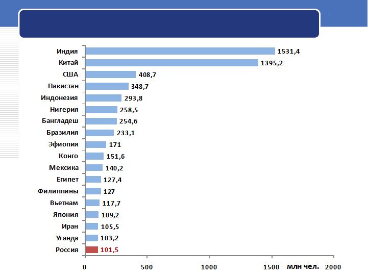 На настоящее время Россия, будучи по-прежнему крупнейшим государством, занимает только шестое место по численности населения. Еще пятьдесят лет назад РСФСР находилась на четвертой позиции, уступая по этому показателю лишь Китаю, Индии и США. При совокупном же учете всего населения СССР советская популяция опережала американскую. Однако к концу тысячелетия Россию обошли Индонезия (4-е место) и Бразилия (5-е место). Согласно долгосрочному прогнозу ООН к 2050 г. Российская Федерация по показателю численности населения будет находиться на 18-й позиции в мире, а в 2100 г. – на 22-й. [4] (См. рис. 3,4).