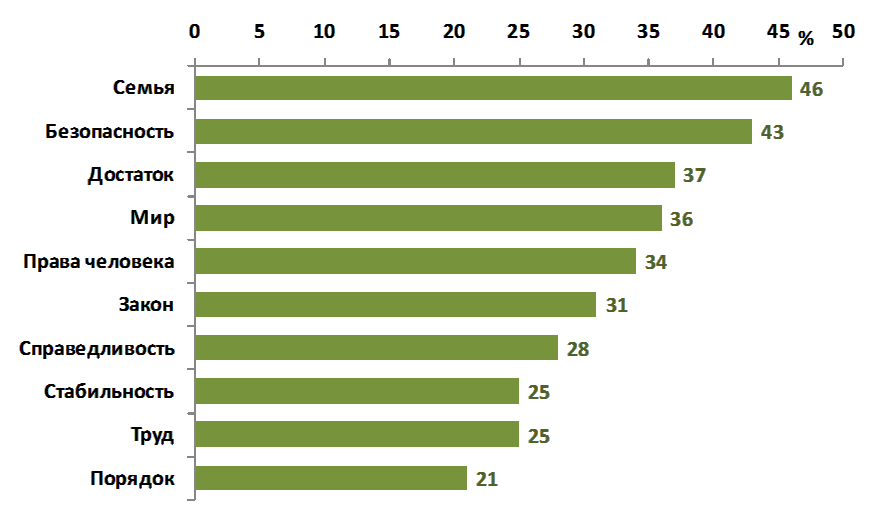 Рис 9. Иерархия ценностных ориентиров российского населения (% от числа опрошенных – не более 5 важнейших для респондента ценностей