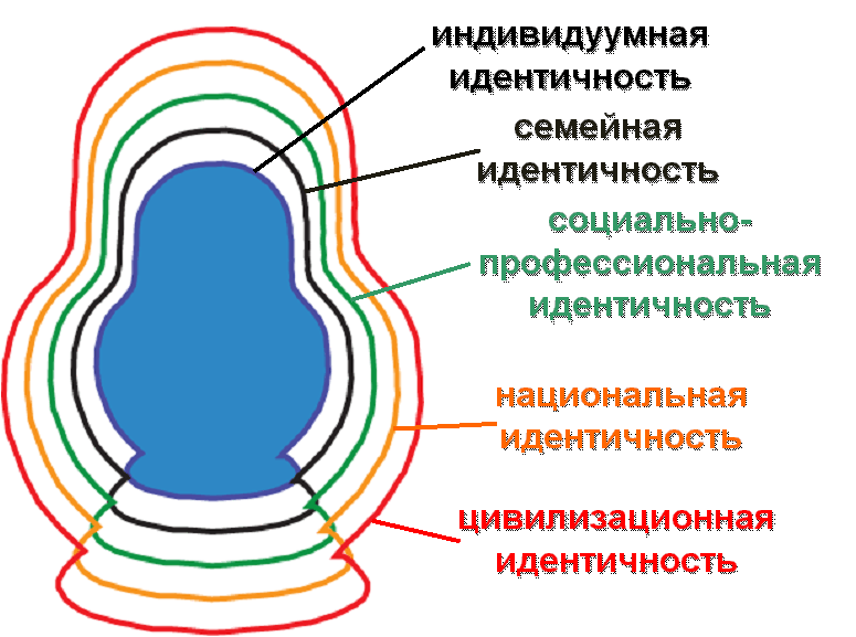 Один из путей разрушения государственной общности заключается в сужение идентификационных масштабов. При устойчивой системе государственности, идентичности выстраиваются по «матрешечному принципу». (См. рис. 7). Максимально широкой является цивилизационная идентификация. Внутри ее наличествует идентификационный пласт национального (народного) уровня интеграционного структурирования. Следующий компонент матрешечного сужения – различного рода социальные интеграторы. Наконец, мельчайшей опорной единицей структуры общностей выступает семья. При разрушении семейных интеграционных связей, человек окончательно десоциализируется. Его идентичность становиться гомогенной, низводиться до уровня атомизированного «я».