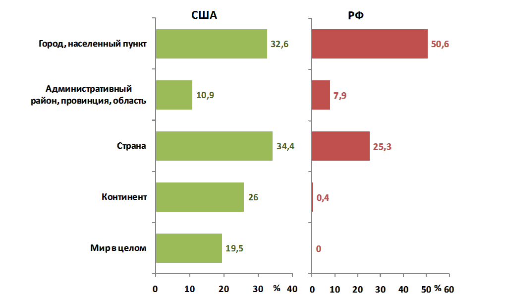 С распадом СССР процесс «матрешечного сужения» продолжился. Согласно международному социологическому опросу, охватившему широкий спектр стран современного мира, региональные идентификаторы у россиян преобладают над общегосударственными. Для сравнения, в США, несмотря на длительную традицию штатовского федерализма, общеамериканская идентичность занимает в идентификационном ряду доминирующее положение. (См. рис.8). [16] На уровне самосознания большинства населения распад России, таким образом, уже фактически подготовлен.