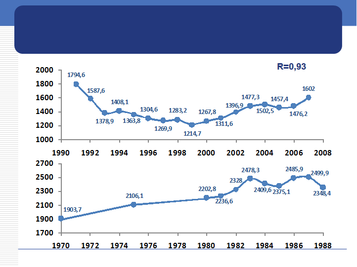 Девяностые годы находятся по отношению к семидесятым в состоянии антикорреляции. Следовательно, постсоветский кризис депопуляции носил рукотворный характер, не будучи связан с естественными процессами динамики воспроизводства населения. Напротив, двухтысячные годы коррелируют с восьмидесятыми по показателю рождаемости в зависимости 0,93. Это означает, что никакого управленческого эффекта в увеличении статистики родившихся за последние годы нет. С абсолютной точностью воспроизводится кривая репродуктивной активности с 21-годовым временным откликом. Но демографически успешные перестроечные были скоротечны. За ними последовал репродуктивный провал девяностых. Следовательно, при неизменности демографической политики, а соответственно, при сохранении существующей корреляционной зависимости в скором времени должен начаться очередной спад в показателях рождаемости.