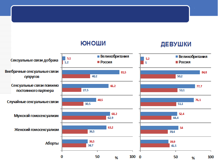 Рис. 18. Отношение российских студентов и английской молодежи к различным формам сексуальных отношений и абортам ( % негативных оценок от числа опрошенных