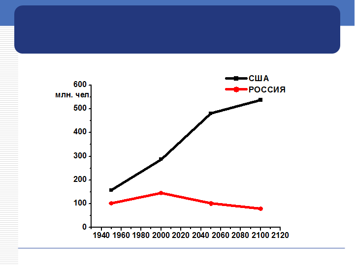Рис 6. Сценарная динамика численности населения в России и США в XXI в. (по прогнозам ООН)