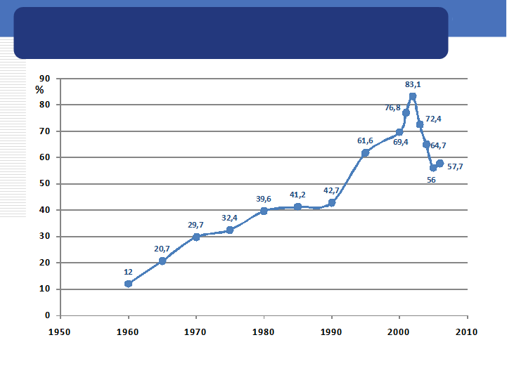 Рис. 16. Удельный вес распадающихся семейных пар в России (в %)