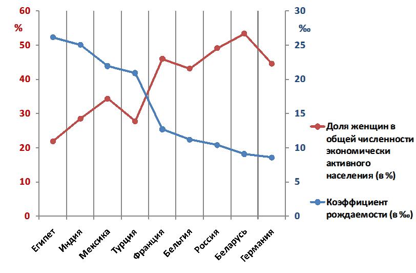 Рис. 15. Зависимость показателей рождаемости от экономической активности женского населения