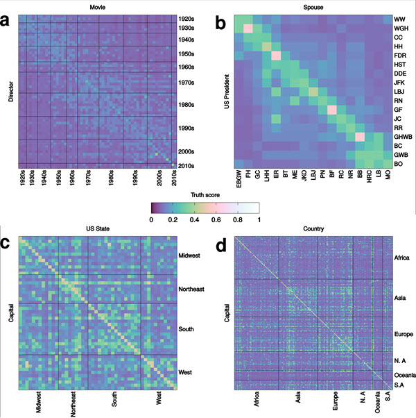 Эти графики показывают «степень правдивости» утверждений, связанных с географией, историей и развлечениями. Правдивые утверждения отображаются на диагонали, интенсивность цвета означает вероятность истинности. (Изображение: Giovanni Ciampaglia)