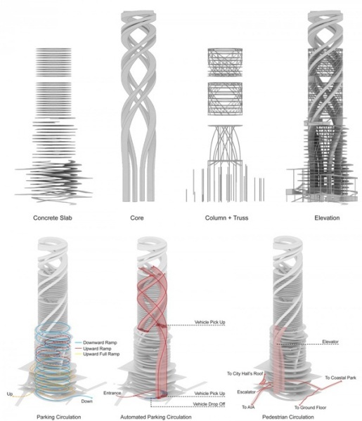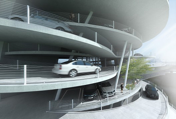 Полностью автоматизированная парковка помещена над мультифункциональной областью, образуя восьмидесятиметровый открытый атриум. На парковочные места автомобили поступают на верхние уровни по спиральному пандусу, предполагающему подъемники и даже специальные рельсы.