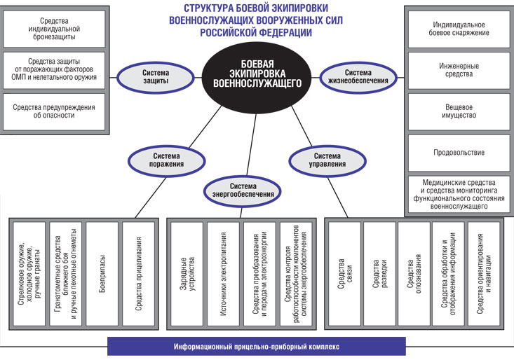 В общих чертах современную боевую экипировку можно представить как сложную интегрированную систему, функционально объединяющую элементы подсистем поражения, защиты, управления, жизнеобеспечения и энергообеспечения (см. схему).