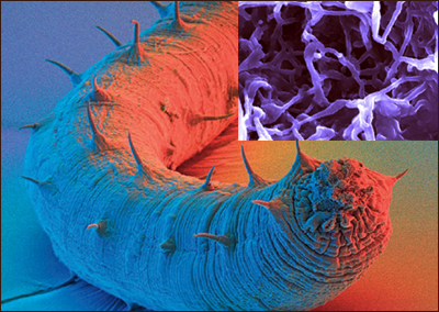Изображение, сделанное с помощью сканирующего электронного микроскопа, показывает нанокомпозит, который может менять свойства: быть мягким в сухом состоянии и жестким под воздействием влаги. На создание данного материала ученых вдохновили морские огурцы