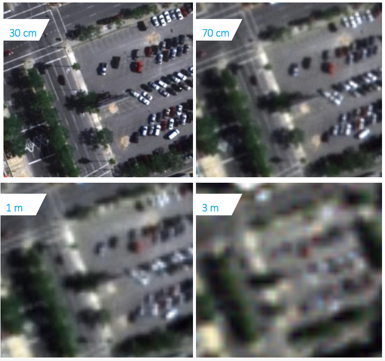 Надо во вниманиепринять то, что на получение снимков всей планеты в качестве пятьдесят сантиметров на пиксель у одного спутника уходит примерно 750 дней (то есть 2 года). Это объясняет необходимость иметь более одного спутника, иначе где-то данные будут актуальными, а где-то — двухлетней давности. Так что у DigitalGlobe на обновление снимков всей планеты уходит порядка ста пятидесяти дней (пять месяцев). Именно по этой причине очень активно развивается аэрофотосъемка, так востребованная в сельском хозяйстве. Разумеется, идетречьлишь о спутниках, которые могут делать снимки требуемого качества. Ниже приведен пример снимков. Видно, что разрешение ниже тридцатисантиметров на пиксель уже значительно ухудшает распознавание объектов.