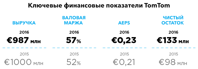 С ростом мобильной индустрии и появлением в 2005 году GoogleMaps сильно упал рынок физической навигационной продукции (бумажные карты, автонавигаторы в виде отдельного устройства или интегрированные), что отлично читается в истории торгов акций TomTom. В результате TomTom решил сделать «пивот» в совершенно другое направление — носимые устройства — трекеры (умные часы) и сейчас имеет капитализацию в $2,2 млрд и годовую выручку около $1 млрд. Рынок интегрированных навигаторов достаточно инертный, но падающий (у многих в авто до сих пор есть CD плеер), поэтому такие компании как TomTom и Here еще получают с этого какой-то доход.