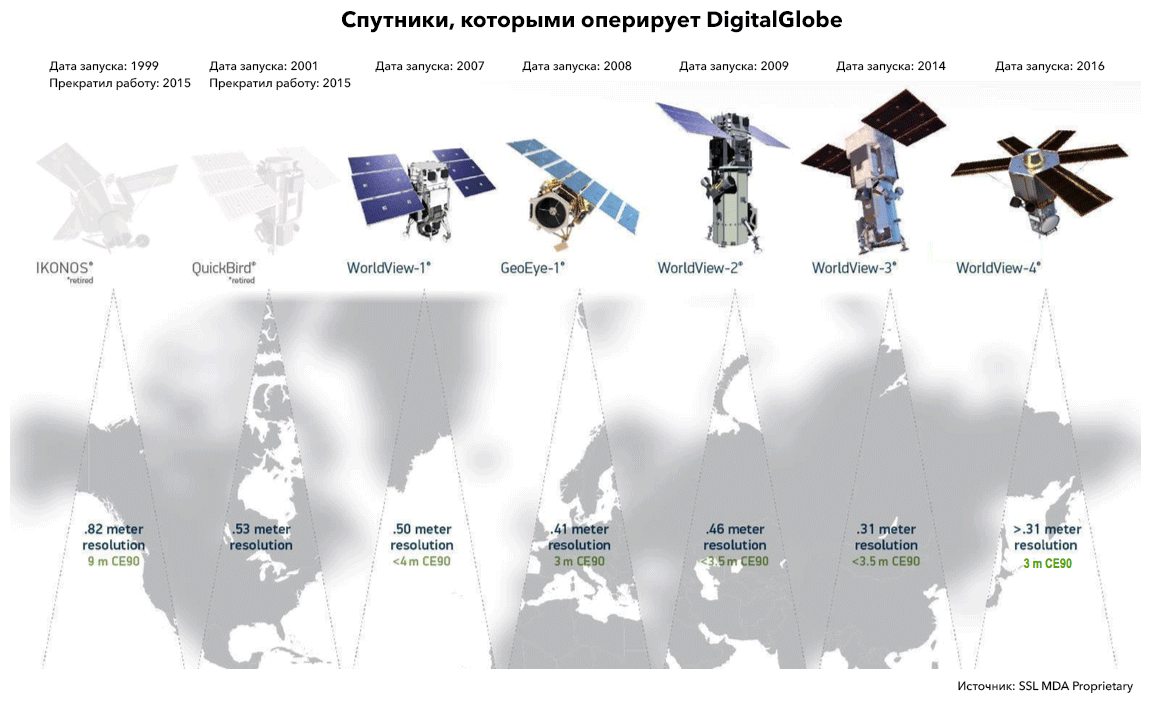 Самый крупный коммерческий игрок и по сути монополист на этом рынке снимков поверхности это компания DigitalGlobe, которая была основана в 1992 году и в своем распоряжении имеетпять специализированных спутников высокого разрешения. DigitalGlobeимеет капитализацию около 2 миллиарда долларов и годовую выручку в 730 миллионов долларов.