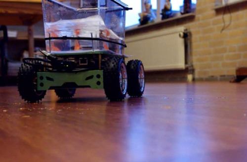 Голландская дизайнерская компания Studio Diip создала передвижной аквариум «Рыба на колесах», которым может управлять домашняя золотая рыбка. Расположенная над баком камера фиксирует положение рыбы и отправляет полученную информацию на компьютер. С него поступают команды на двигатель и рулевое управление. Если рыба плывет вперед, то и аквариум движется вперед, а если рыбка плывет назад, то и аквариум движется в обратном направлении.