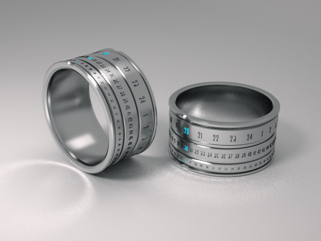 Интерес к модели Ring Clock привлекает особое расположение циферблатов по поверхности кольца. Часы состоят из трех отдельно вращающихся шкал, каждая из которых обозначает соответственно минуты, часы и секунды. Шкалы Ring Clock вращаются и узнать время можно, глядя на выстроенные цифры в ряд между двумя выгравированными отметинами. Для удобства текущее время подсвечивается.