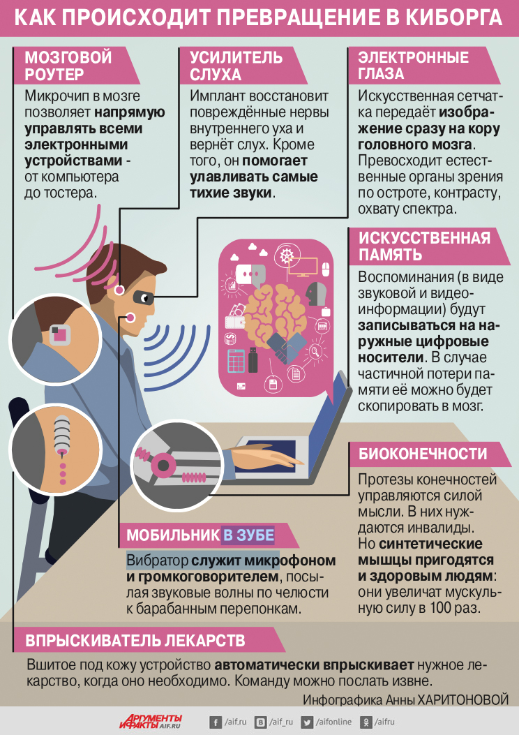 Прогресс постепенно превращает нас в киборгов. Наука уже научилась заменять отсутствующие части тела превосходящими их по силе протезами и соединять мозг с компьютером. В Германии создали первую в мире микросхему, где живые нервные клетки соединены с кремниевым компонентом, - в будущем это позволит заменять повреждённые органы и ткани, восстанавливая утраченные слух, зрение и даже умственные способности. В США разрабатывают имплант для мозга, который будет возвращать утерянные в результате черепно-мозговых травм воспоминания.