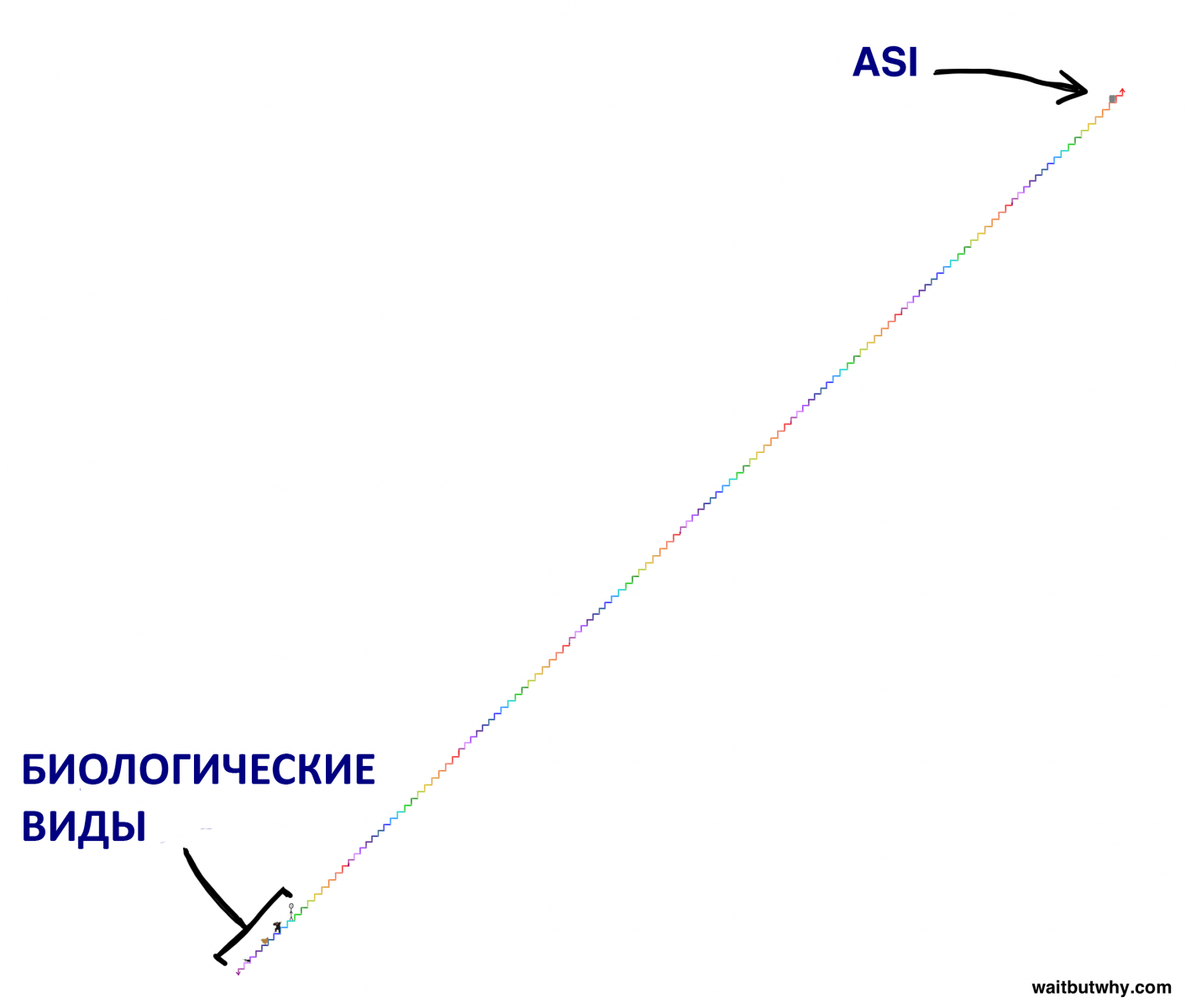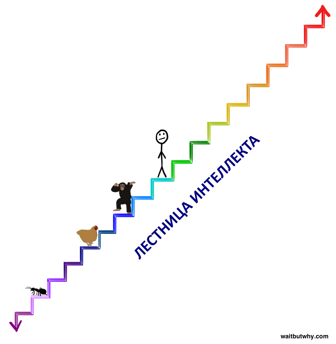 Теперь вы, уставившись в экраны мониторов, наверное, гадаете, какие чувства вам следует испытывать, пока вы пытаетесь переварить эту информацию. Тем временем, до того, как окунуться во все это с головой, давайте вспомним, что значит для машины обладание сверхинтеллектом. Существует ключевое различие между быстрым сверхинтеллектом и качественным сверхинтеллектом. Часто, когда мы пытаемся представить суперумный компьютер, мы первым делом думаем, что он так же умен, как и человек, только способен думать намного быстрее (вспомните х/ф «Она», скорость является основной чертой, отличающей супер ОС от человека), то есть, ему потребуется минут пять, чтобы решить задачу, на которую у человека уйдет лет десять. Звучит впечатляюще, и ASI действительно будет мыслить в разы быстрее любого человека, но настоящее отличие будет заключаться в качестве этого мышления, а не в его скорости, что принципиально все меняет. Разница в умственных способностях между человеком и шимпанзе заключается не в скорости мышления, а в том, что человеческий мозг содержит большее количество сложных когнитивных модулей, которые позволяют нам строить сложные лингвистические обозначения, долгосрочные планы или отвлеченные рассуждения, тогда как мозг шимпанзе на это просто не способен. Ускорение работы мозга шимпанзе в тысячу раз не принесет такого результата даже через десятилетие. Шимпанзе по–прежнему не будет способен собрать замысловатую модель, используя набор специальных инструментов, тогда как человек справится с этим за пару часов. Существует огромное количество когнитивных функций, которые никогда не станут доступны шимпанзе, вне зависимости от того, сколько времени у него уйдет на попытки. Проблема не в том, что шимпанзе не может делать то же, что под силу нам, а в том, что шимпанзе даже не способен понять, что такие возможности существуют. Шимпанзе может приблизительно понимать, что такое человек и что такое небоскреб, но он никогда не поймет, что люди построили небоскребы. Для шимпанзе все большое является частью природы и точка, сама возможность построить небоскреб лежит за гранью его понимания. Все это является результатом небольшого различия в качестве разума. В масштабе интеллектуального диапазона, о котором мы говорим сейчас, или даже такого диапазона между биологическими существами, разница между интеллектом шимпанзе и интеллектом человека ничтожно мала. Специально для вас я решил выстроить в ряд биологические существа по уровню их когнитивных возможностей, используя изображение лестницы (А — Расположение этих существ на лестнице не основано ни на каких научных данных и просто призвано донести общую суть, Б – я очень горжусь этими рисунками):