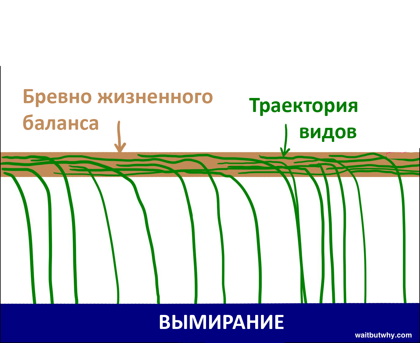 Никто в этом мире, и уж точно не я, не сможет ответить вам на этот вопрос. Но Оксфордский профессор философии и лидирующий исследователь в области искусственного интеллекта, Ник Бостром считает, что мы можем свести все варианты событий в две широкие категории. Во–первых, взглянув на историю, мы видим, что жизнь устроена следующим образом: новый вид появляется, существует какое–то время и потом неизбежно теряет равновесие и сваливается с бревна жизни, оказываясь в зоне вымирания: