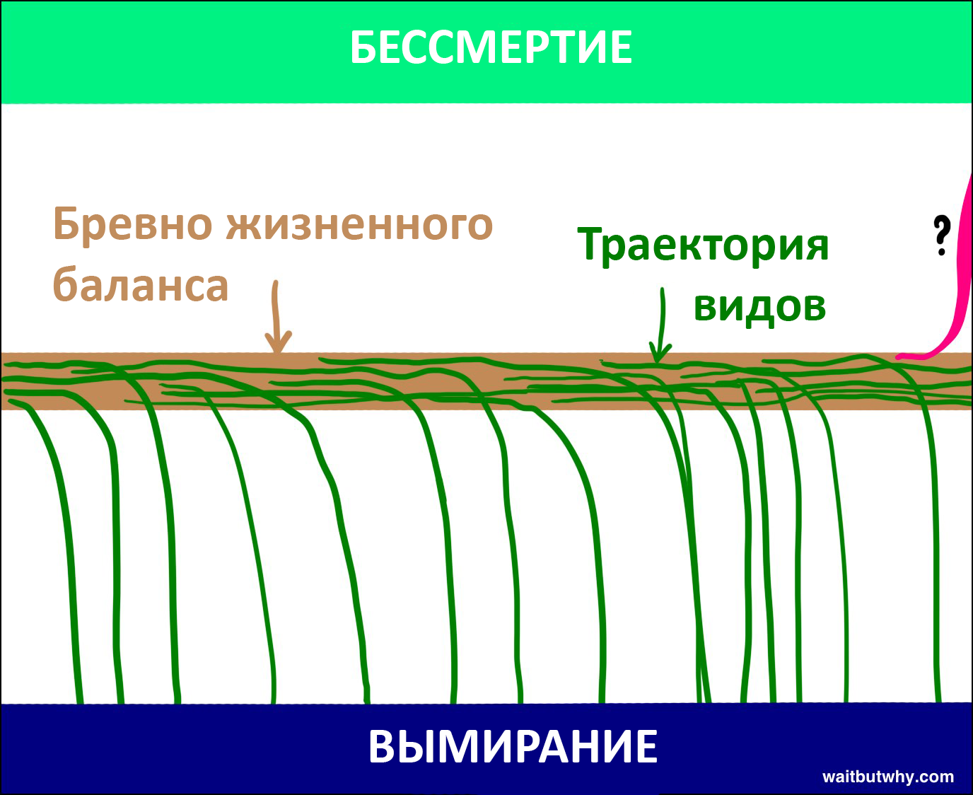 «Все виды в конечном счете вымирают» — было почти таким же надежным правилом, как и «все люди умирают». Пока что 99.9 % живых существ не удержали свое равновесие и сорвались с бревна. Отчетливо ясным кажется, что находясь на грани вымирания и из последних сил цепляясь за это бревно, вид может быть легко сброшен любым катаклизмом или появлением нового вида. Ник Бостром называет вымирание аттрактором — состоянием, в которое попадают все существа и никогда из него не возвращаются обратно. Хотя большинство ученых, с работами которых я сталкивался, считают, что появление ASI обречет человечество на вымирание, многие все же верят, что при грамотном использовании ASI может привести отдельных людей или весь вид ко второму состоянию аттрактора – бессмертию вида. Бостром убежден, что бессмертие вида, как и его вымирание, представляет собой состояние аттрактора. Как только мы достигнем его, мы навсегда победим смерть. Таким образом, несмотря на то, что все виды до сих пор падали в сторону зоны вымирания, Бостром считает, что у бревна есть два края и никто на Земле еще не был достаточно умен, чтобы понять, как свалиться в другую сторону.
