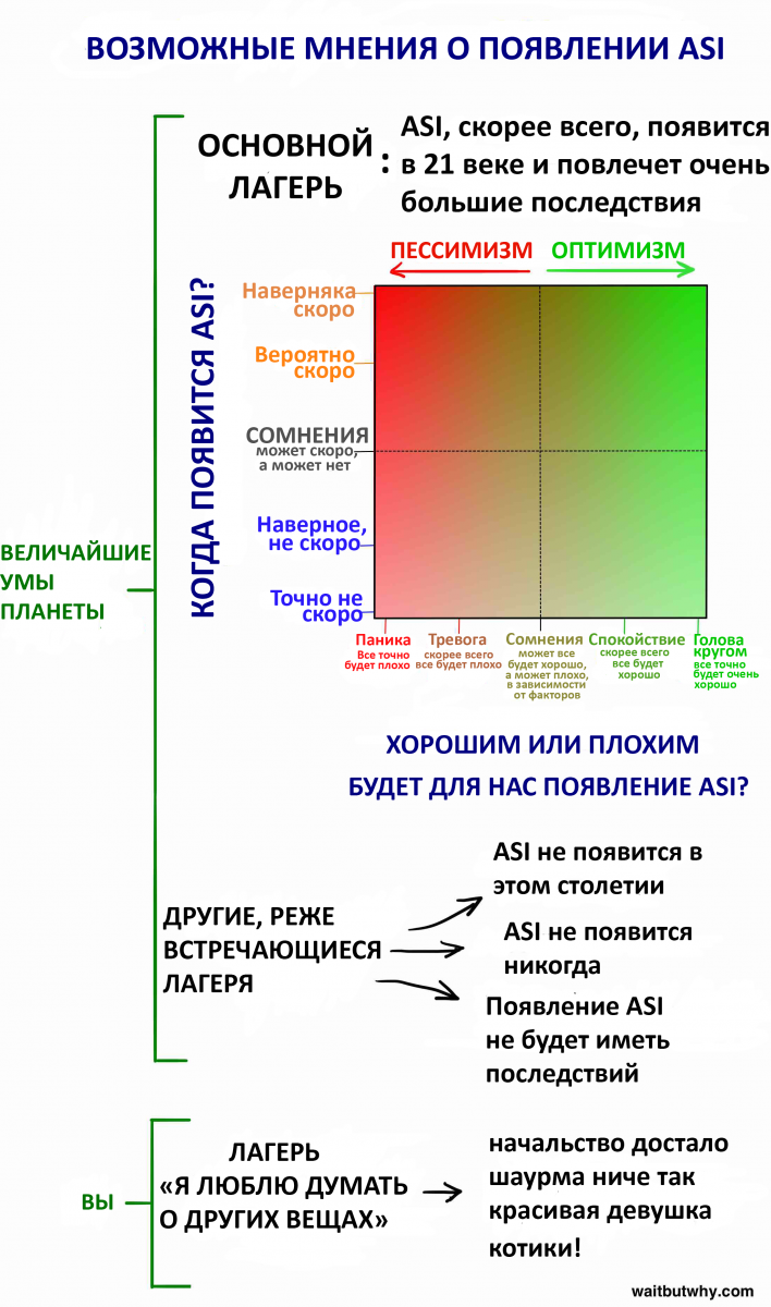 Скажите, определились ли вы со своей позицией? На самом деле, я знаю, что вы скажете, потому что я считал так же, пока не углубился в исследование этого вопроса. Некоторые причины, по которым люди не особо задумываются над этой темой: Как мы уже говорили фильмы существенно запутали нас, показывая нереалистичные сценарии развития ИИ, заставляя нас думать, что ИИ не является чем–то, что стоит воспринимать всерьез. Джеймс Баррат сравнивает подобную реакцию с тем, как если бы центры по контролю и профилактике заболеваний сделали бы серьезное предупреждение о надвигающейся опасности наступления эпидемии зомби. Это называется когнитивными предрассудками, нам тяжело поверить в реальность чего–то, пока мы не увидим доказательства этому. Я уверен, что ученые в 1988 постоянно обсуждали насколько серьезным будет развитие интернета, но люди не задумывались о том, как он изменит их жизнь, пока этого не произошло. Отчасти так было из–за того, что компьютеры в 1988 году не были столь функциональны, и глядя на них, люди не верили, что те скоро изменят их жизни. Их воображение было ограничено личным опытом и не позволяло отчетливо представить себе, чем могут стать компьютеры. То же самое происходит сейчас и с ИИ. Мы слышим, что это все очень серьезно, но наш опыт, которому известны только относительно слабые ИИ, усложняет для нас возможность поверить в коренные перемены, которые привнесет сверхинтеллект. С такими предрассудками и борются эксперты, пытаясь отвлечь наше внимания от ежедневного шума нашего эго. Даже если бы мы и поверили – сколько раз за день вы задумываетесь о том, что проведете большую часть вечности в небытии? Не так много, верно? Хотя этот факт значимее любого из ваших повседневных занятий. Наш мозг концентрируется в основном на более мелких обыденных задачах, независимо от того, насколько безумной является долгосрочная ситуация, в которой мы находимся. Просто мы так устроены. Одна из целей этого поста — переманить вас из лагеря «Я люблю думать о других вещах» в один из экспертных лагерей, даже если вы просто стоите в абсолютной неуверенности на пересечении двух пунктирных линий в нижней диаграмме. В ходе этого исследования я наткнулся на десятки различных мнений по данному вопросу, но быстро заметил, что их все можно объединить в один основной лагерь и, в частности около ¾ экспертов попали в два подлагеря внутри основного: