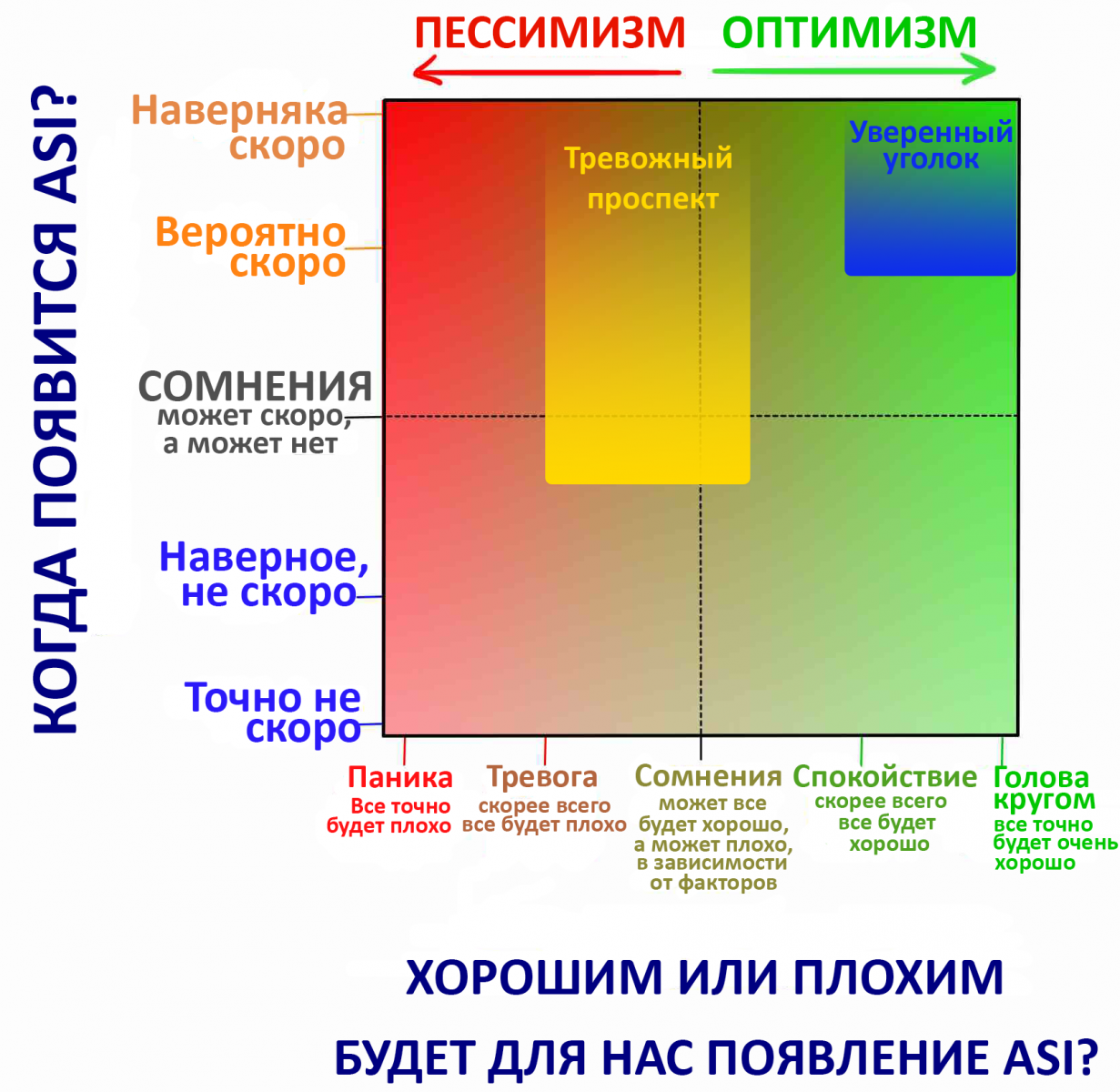 В зависимости от ответа на него, мы решим, должен ли ASI вызывать у нас восхищение или страх. Конечно же, научное сообщество и здесь существенно расходится в мнениях и ведет жаркие споры. В опросе Бострома участникам предлагалось оценить вероятность возможных последствий влияния AGI на человечество: 52% считают, что последствия будут хорошими или даже очень хорошими; 31% считают, что последствия будут плохими или очень плохими. Только 17% посчитали, что последствия будут нейтральными. Иными словами, люди, которые лучше всего осведомлены в этой теме, уверены, что это все это очень серьезно. Следует заметить, что речь здесь шла только об AGI, если бы вопрос был об ASI, процент с нейтральной оценкой, вероятнее всего, был бы намного ниже. Пока мы еще полностью не углубились во всю эту риторику хороших и плохих последствий, давайте пока объединим обе части вопроса «когда это случится?» и «будет ли это чем–то плохим или хорошим» в один график, который включает в себя мнения большинства соответствующих экспертов: