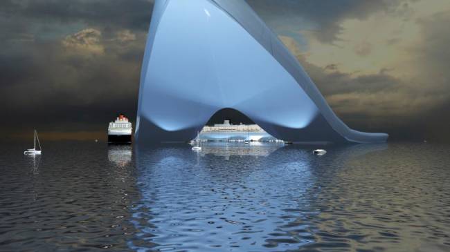 490 тыс. м² — вот сколько занимает этот своего рода терминал, способный принять одновременно три круизных лайнера. К услугам пассажиров номера с видом на открытый океан, магазины и рестораны. Во внутреннюю «гавань» смогут заходить суда поменьше. 10% крыш закроют фотогальванические элементы, обещают голландские дизайнеры из Waterstudio.NL, уже приступившие, между прочим, к созданию плавучего города близ Гааги и разрабатывающие проекты для Мальдив, Китая и ОАЭ. (Иллюстрация Koen Olthius / Dutch Docklands.)