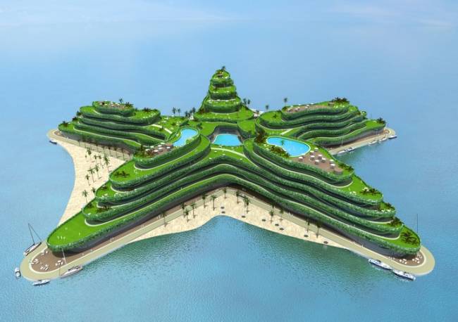 А этот плавучий отель и конференц-центр под названием «Зелёная звезда» (Greenstar) откроется в 2014 году на Мальдивских островах. Это самая низменная страна мира, то есть в случае повышения уровня моря её смоет первой. В конференциях смогут участвовать до двух тысяч человек, и восемьсот из них можно будет разместить в удобных номерах. Waterstudio.NL надеется, что это место подойдёт для климатических переговоров. (Иллюстрация Koen Olthius.)
