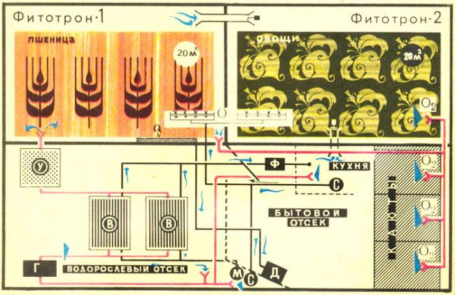 Схема газо— и водообмена в экспериментальном комплексе «Биос-3». Пути движения газов показаны оранжевыми линиями, воды — черными. Голубыми стрелками показано направление движения. Буквами обозначены: В — культиваторы водоросли хлореллы, Г — газодувка, У — угольный фильтр, С — сборники сточной воды в кухне и туалете, Q — коллектор отбора конденсата влаги в фитотроне, Д — емкость для кипячения и хранения бытовой воды, М — коллектор мочи, Ф — узел сорбционной доочистки питьевой воды.