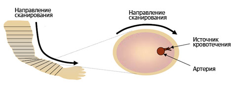 После этого и происходит фокусировка излучения с нагревом тканей и свёртыванием крови.