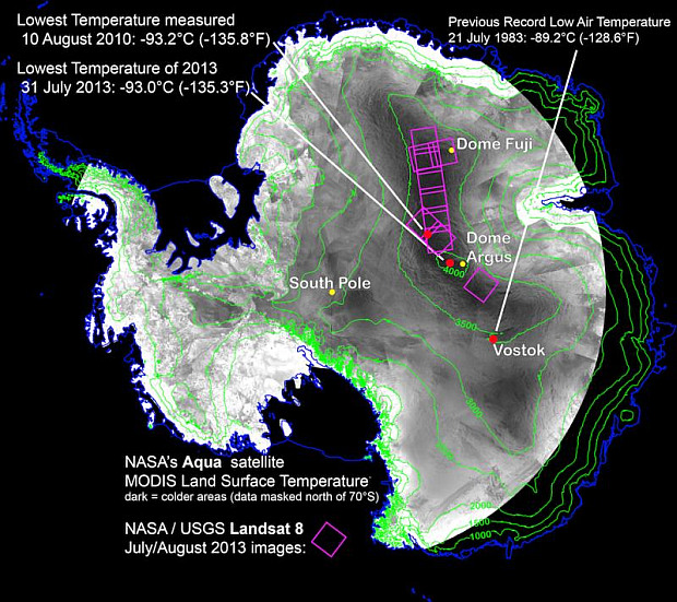 Скамбос рассказал, что рекордные температуры были обнаружены в пяти карманах на расстоянии 10 километров, где рельеф образует небольшие впадины глубиной от 2 до 4 метров. Эти впадины находятся в непосредственной близости от ледового хребта, который проходит между Куполом Аргуса и Куполом Фуджи – ледяных вершин на ледовом щите Восточной Антарктиды. Антарктические базы установлены на каждой из них, и, как правило, во время антарктических зим они не функционируют.