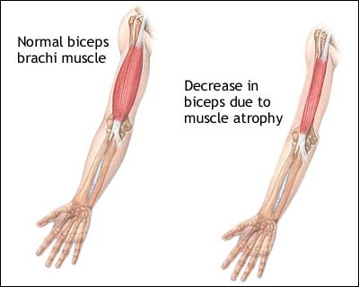 и передвигаться без костылей. На рисунке: нормальный бицепс (слева); бицепс с мышечной дистрофией (справа)