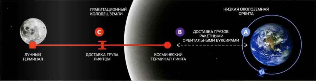 С Земли на низкую околоземную орбиту грузы доставляются традиционными ракетами на химическом топливе. Оттуда орбитальные буксиры забрасывают грузы на «нижнюю лифтовую площадку», которая надежно заякорена закрепленным за Луну тросом. Лифт доставляет грузы на Луну. За счет отсутствия необходимости торможения (да и самих ракет) на последнем этапе и при подъеме с Луны возможна значительная экономия средств. Но, в отличие от описанной в статье, такая конфигурация практически повторяет идею Цандера и не решает проблему вывода полезной нагрузки с Земли, сохраняя для этого этапа ракетную технологию.