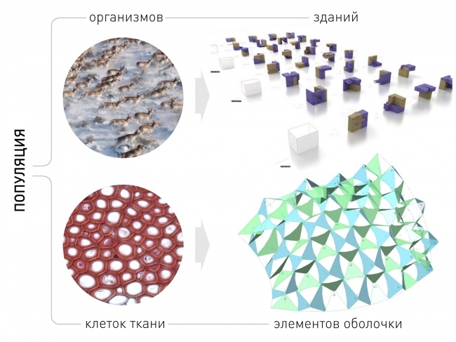 Для здания можно написать алгоритм морфогенеза, который применительно к разному исходному материалу выдаст разные результаты, но они будут членами одной “популяции”. Получается архитектурный полиморфизм, современная замена типовому строительству: типизировать можно и так, чтобы одинаковых зданий не было, но были одинаковые технологические и конструктивные приёмы.