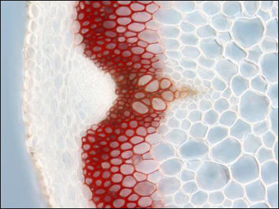 На данном изображении растительных клеток арабидопсиса красным цветом отмечен лигнин, препятствующий эффективной переработке биомассы в топливо