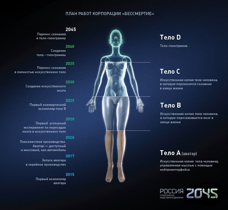 Перенос нематериальной структуры сознания человека в полностью искусственное тело – это третье и самое сложное направление, поэтому на его реализацию у корпорации отведено около 20 лет. Дмитрий Ицков также подчеркивает, что и разработка принципиально новых тел не останется без внимания его компании. Известный футуролог Рэй Курцвейл уверен, что искусственное тело будет состоять из нанороботов, способных принимать любую форму по желанию.