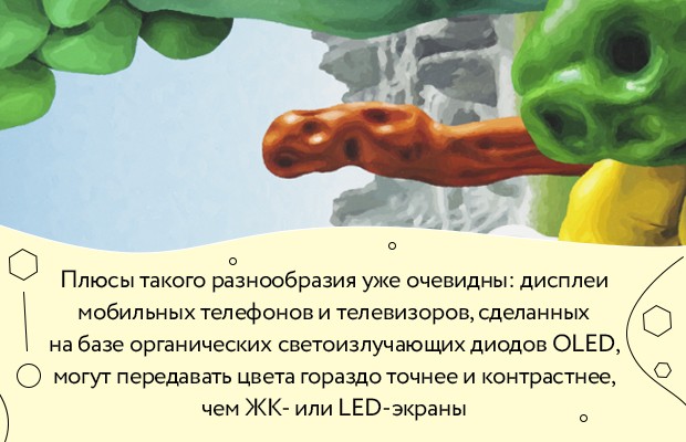 Подведем итог: простота синтеза, разнообразие свойств, дешевизна, в некоторых случаях эффективность. Сплошь серьезные и весомые аргументы. Но нас — людей, испорченных рекламой, — они уже не особо впечатляют. Поэтому забудем про рациональные доводы — просто рассмотрим несколько устройств органической электроники.