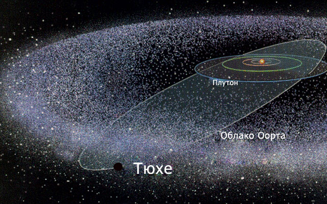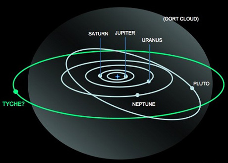 Представленная американскими учеными схема выглядела таким образом: гравитация Тюхе, захватив притяжением глыбу газа и льда в облаке Оорта, притягивает её, затем начинают действовать законы небесной механики. Проходя мимо таинственной незнакомки, глыба льда вылетает со стремительным ускорением. Удивительные процессы, которые способна творить с космическими объектами обычная гравитация.