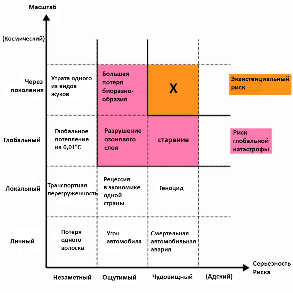Видите, отметка Экзистенциальный риск обозначает то, что является конечным и сменяет поколения и целые виды, при этом она постоянна и включает в себя смертельные последствия (мне показалось, что Бостром поместил старение слишком высоко, но глядя через призму возможного бессмертия, которое мы обсудили раньше – это не лишено смысла; если мы победим смерть, то старение людей в прошлом будет казаться ужасной трагедией, которая убила всех, пока ее не излечили). Технически эта отметка описывает ситуацию, при которой все люди находятся в постоянных пытках и мучениях, т.е. вымирают. Существуют три вещи, которые могли бы вызвать экзистенциальную катастрофу: