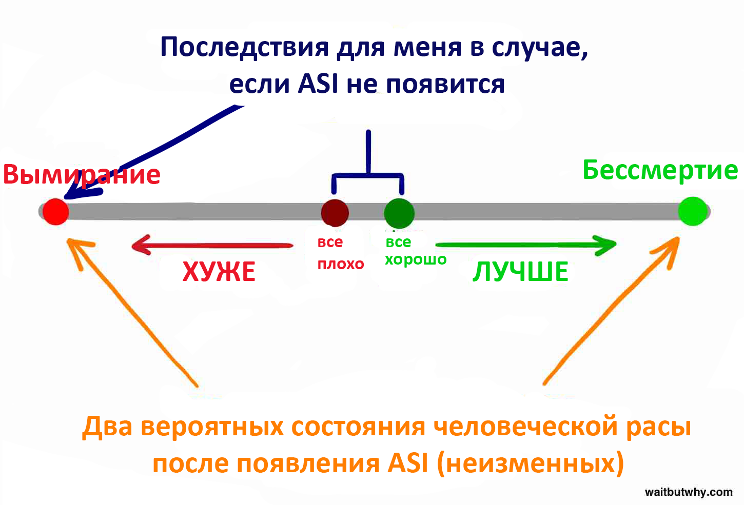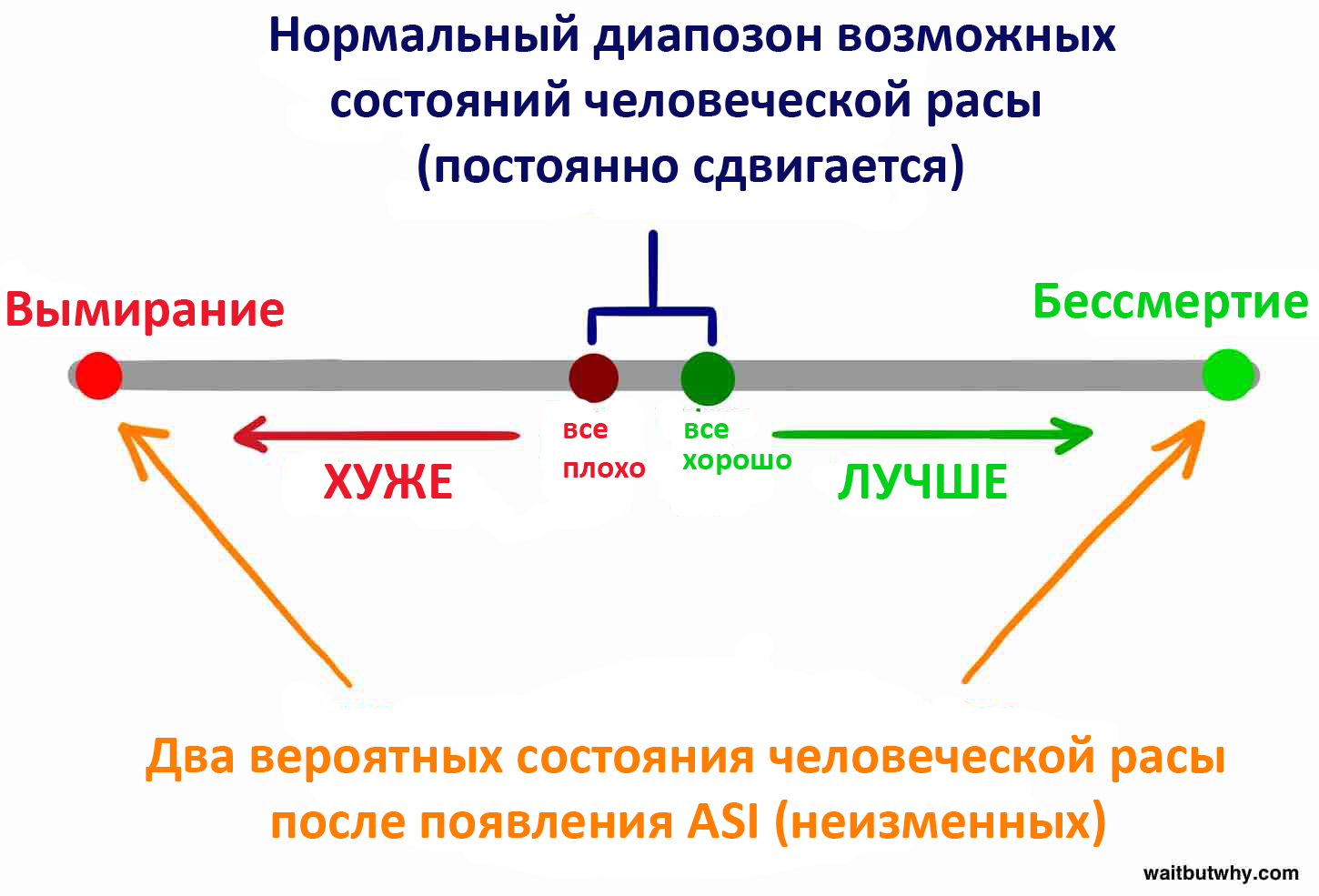 Вы будете слышать все больше и больше о потенциальных угрозах ASI – растущая безработица, так как ИИ занимают все больше рабочих мест. (По этому поводу можно много чего сказать, но, кажется, люди думают, что если они доживут до революции ИИ, то мы начнем жить в мире богатства и процветания, и какая–то новая система перераспределения будет платить безработным. В конечном итоге мы будем жить в мире, где работа и заработок не будут связаны между собой. Бостром считает, что такое распределение произойдет не во имя общего равенства и социального сострадания, а по причине того, что все люди участвовали в этом риске, нравилось им это или нет. Таким образом, мы все должны будем разделить эту награду, если доживем). Человеческая популяция подскочит, если мы решим проблему старения (ASI к этому моменту придумает способ, как уместить больше людей на планете в комфорте и как освоить другие планеты). Но единственный страх, которым мы должны быть одержимы — это страх экзистенциального риска.